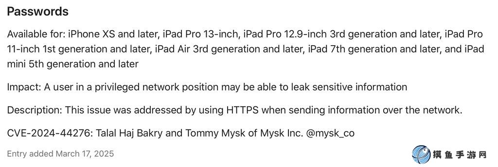 苹果在 2024 年 12 月发布的 iOS 18.2 更新中,并在3 月 17 日更新日志,已经修复了 Passwords 应用的该漏洞,默认使用加密协议,避免未受保护的 HTTP 连接。